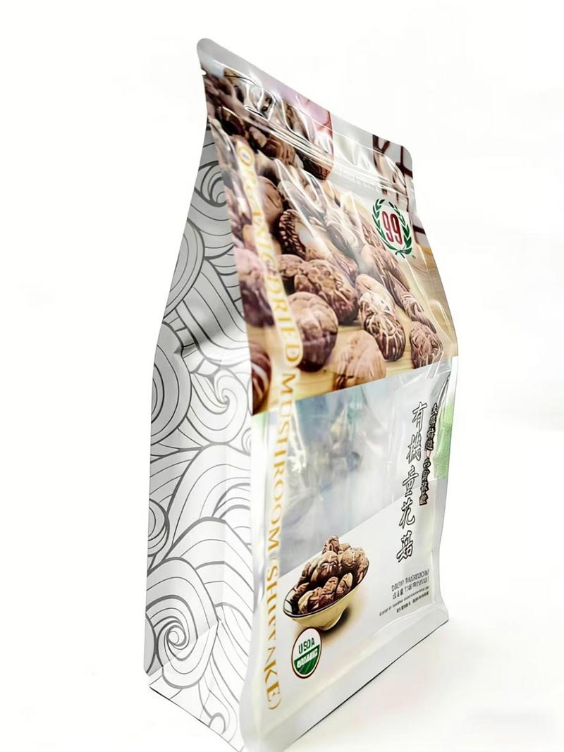 ထုပ်ပိုးမှုရွေးချယ်မှုသည် သစ်သီးခြောက်များ၏ သိုလှောင်မှုနှင့် တင်ပြမှုအပေါ် တိုက်ရိုက်သက်ရောက်မှုရှိသည်။ စျေးကွက်တွင်ရရှိနိုင်သောအဓိကထုပ်ပိုးအမျိုးအစားများတွင်သုံးခြမ်းတံဆိပ်၊ လေးဘက်တံဆိပ်၊ မတ်တပ်အိတ်များနှင့်ရှစ်ခြမ်းတံဆိပ်အိတ်များပါဝင်သည်။ ယင်းတို့အနက် ရှစ်ခြမ်းတံဆိပ်အိတ်သည် ဦးစားပေးရွေးချယ်မှုဖြစ်သည်။ အခြားအိတ်အမျိုးအစားများနှင့် နှိုင်းယှဉ်ပါက၊ ရှစ်ခြမ်းတံဆိပ်အိတ်သည် အလုံပိတ်အစွန်းရှစ်ခုပါရှိပြီး ၎င်းကို အောက်ခြေပြားချပ်ချပ်ဖြင့် မတ်တပ်ရပ်စေပြီး စတိုးဆိုင်စင်များပေါ်တွင် ပြသရန် စံပြဖြစ်စေပါသည်။ ဤအိတ်အမျိုးအစားသည် တံဆိပ်တပ်ရန်အတွက် နှစ်ဖက်စလုံးကို ပံ့ပိုးပေးထားပြီး လက်လီနှင့် e-commerce နှစ်မျိုးလုံးအတွက် သင့်လျော်သောကြောင့် ဂရပ်ဖစ်အမျိုးမျိုးဖြင့် စိတ်ကြိုက်ပြုလုပ်နိုင်ပါသည်။